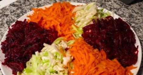 მომზადების წესი: გახეხეთ მსხვილ სახეხზე სტაფილო, ჭარხალი და ვაშლი. დასრისეთ ხელით და დაამატეთ ლიმონის წვენი და მცენარეული ზეთი.